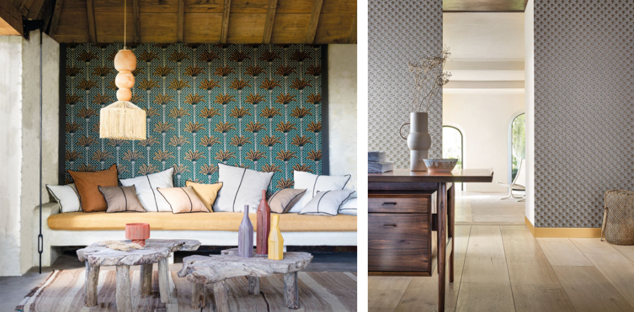 Los colores dorados y tostados se complementan con azules y verdes profundos, dejando destellos brillantes y patrones florales y exóticos. Diseños elegantes y acogedores, perfectos para salones y zonas de descanso. Sus colores y su estilo hacen que se complementen tanto con estilos rústicos como en espacios más modernos, brillando especialmente, como es lógico, acompañados de arquitectura y muebles de inspiración oriental.